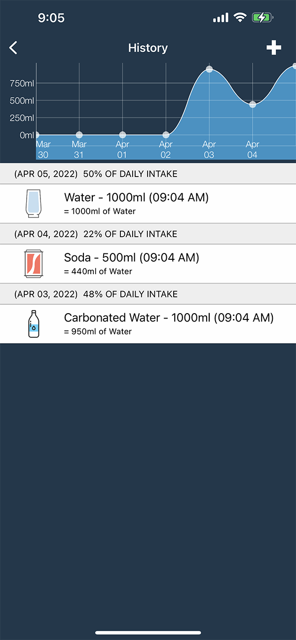 View your drink history and see your hydration progress using our interactive charts and table views.